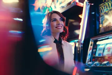 A woman smiling by bright slot machines showing lucky symbols, showcasing the exciting slot offerings at BDT88.